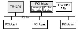 本方案采用了SAMSUNG的S3C2510(ARM940T內(nèi)核)和PHILIPS的Trimedia1300(TM1300) 數(shù)字信號處理器,ARM940T內(nèi)置了PCI2.1規(guī)范的總線接口,Trimedia1300可以作為PCI的MASTER和SLAVE,基本架構(gòu)如圖 -1。