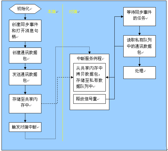 過程說明:本端處理器作初始化,創(chuàng)建同步事件,打開消息通訊句柄, 同步事件用于讀取數(shù)據(jù)時任務(wù)阻塞,然后創(chuàng)建通訊數(shù)據(jù)包并且發(fā)送,發(fā)送例程將數(shù)據(jù)存儲在共享緩沖區(qū)內(nèi),最后觸發(fā)對方中斷。對端處理器進(jìn)入中斷響應(yīng),首先中斷例程分析共享數(shù)據(jù)區(qū)的通訊數(shù)據(jù)狀態(tài),發(fā)現(xiàn)某通道有新的未處理數(shù)據(jù)后,將其拷貝至自己的私有內(nèi)存空間,并清理自己的共享數(shù)據(jù)區(qū)狀態(tài),然后釋放在等待中的通訊任務(wù)的信號量,使讀通訊數(shù)據(jù)包的任務(wù)解除阻塞狀態(tài),從私有數(shù)據(jù)區(qū)讀取通訊數(shù)據(jù)包并作相應(yīng)處理。
