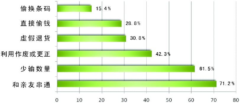 收銀員作為超市現(xiàn)金作業(yè)的直接管理者,責(zé)任重大,任何不當(dāng)行為都會(huì)給超市這個(gè)微利企業(yè)造成極大損失。收銀環(huán)節(jié)造成的內(nèi)盜和損耗主要有以下常見(jiàn)問(wèn)題: