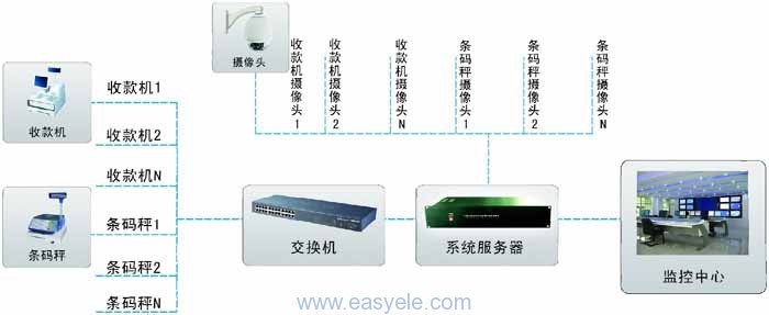 本系統(tǒng)要實(shí)現(xiàn)的主要功能有:現(xiàn)前臺(tái)員工每次掃描商品,都會(huì)在監(jiān)控畫(huà)面上同步顯示出商品名稱、單價(jià)、數(shù)量、金額、款臺(tái)號(hào)、員工號(hào)等信息,通過(guò)后臺(tái)系統(tǒng)管理軟件實(shí)現(xiàn)商品信息集中管理,并可單獨(dú)回放指定員工、商品的錄像片段。