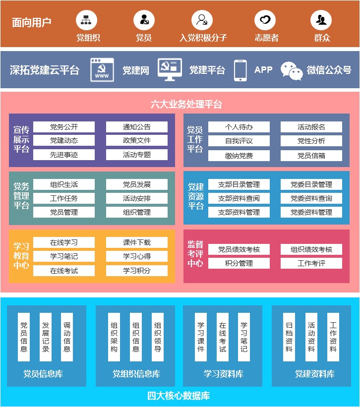 智慧黨建平臺包括“1云4庫6平臺”,一云指的是智慧黨建云,4庫分別是黨員信息庫、黨組織信息庫、學習資料庫、黨建資料庫,6平臺分別是:黨建宣傳平臺、黨員學習平臺、黨員工作平臺、黨務(wù)管理平臺、監(jiān)督考評平臺、黨建資源平臺。