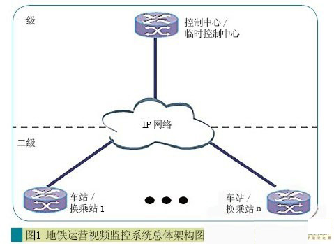 其中運營視頻監(jiān)控系統(tǒng)為二級架構,在車站/換乘站設立二級監(jiān)控中心,負責監(jiān)控本站相關情況,在控制/備用中心設立一級監(jiān)控中心,負責整個線路的遠程監(jiān)控,架構示意如圖1所示。