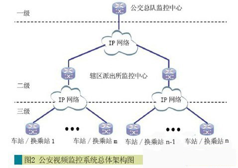 公安視頻監(jiān)控系統(tǒng)為三級架構,在車站/換乘站公安值班室設立三級監(jiān)控中心,負責監(jiān)控本站相關情況,在派出所設立二級監(jiān)控中心,負責監(jiān)控轄區(qū)所在車站/換乘站相關情況,在公交總隊設立一級監(jiān)控中心,負責整個線路的遠程監(jiān)控,架構示意如圖2所示。