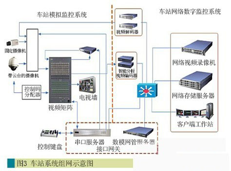 現(xiàn)階段地鐵交通視頻監(jiān)控系統(tǒng)中,會牽涉大量的模擬視頻設備和數(shù)字視訊設備,典型的模擬設備有矩陣、字符迭加器、模擬攝像機、云臺、多畫面分割器等,典型數(shù)字設備有網(wǎng)絡視頻錄像機、存儲服務器、安防平臺服務器、安防管理服務器、接口網(wǎng)關、磁盤陣列、編碼器、譯碼器、數(shù)字回放終端等。該方案能夠使這些數(shù)字和模擬設備融合在一個系統(tǒng)中,使兩者之間能夠互聯(lián)互通、互訪互控。
